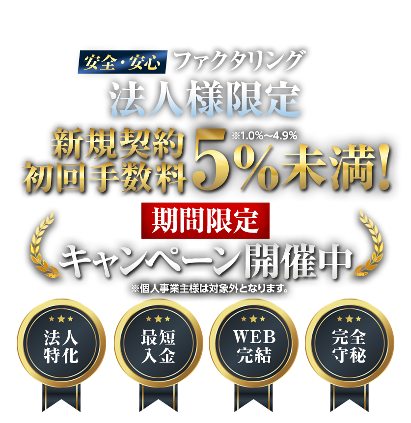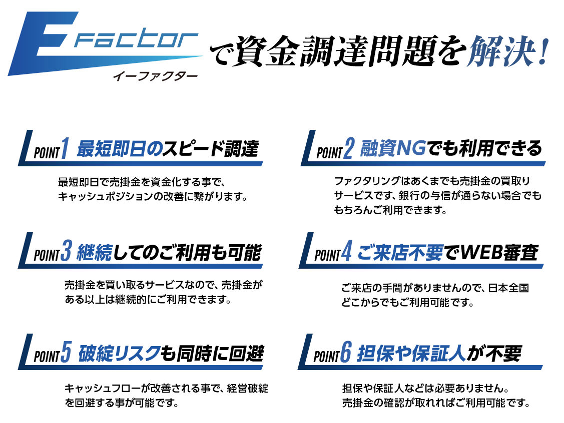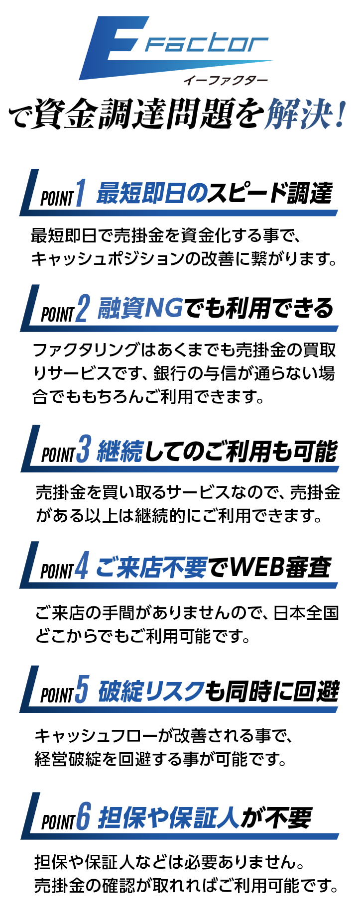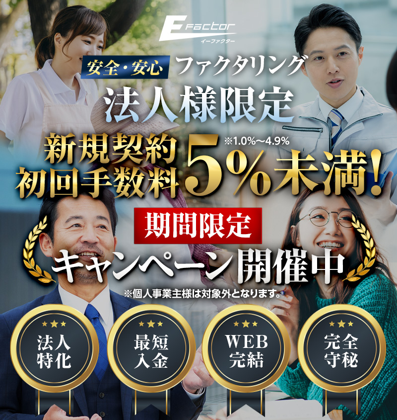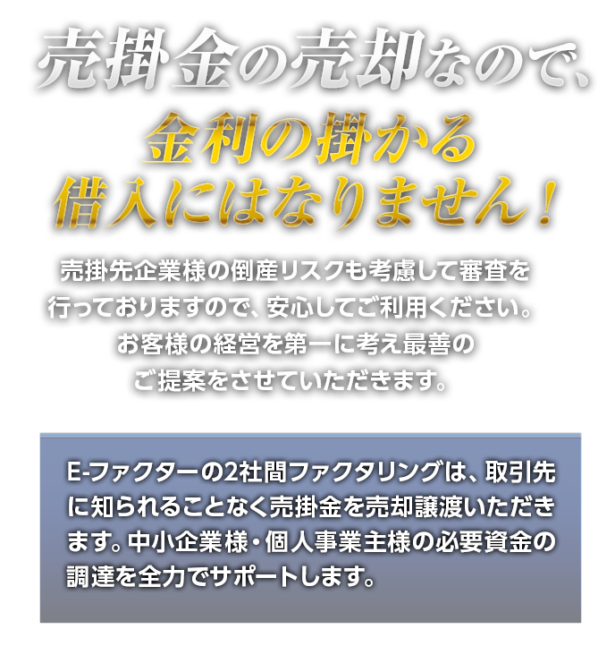 売掛先の倒産リスクも含めてお買取をさせていただきますので、お客様に返済の義務はございません。Eファクターではノンリコース【償還請求権なし】での契約になりますのでご安心ください。